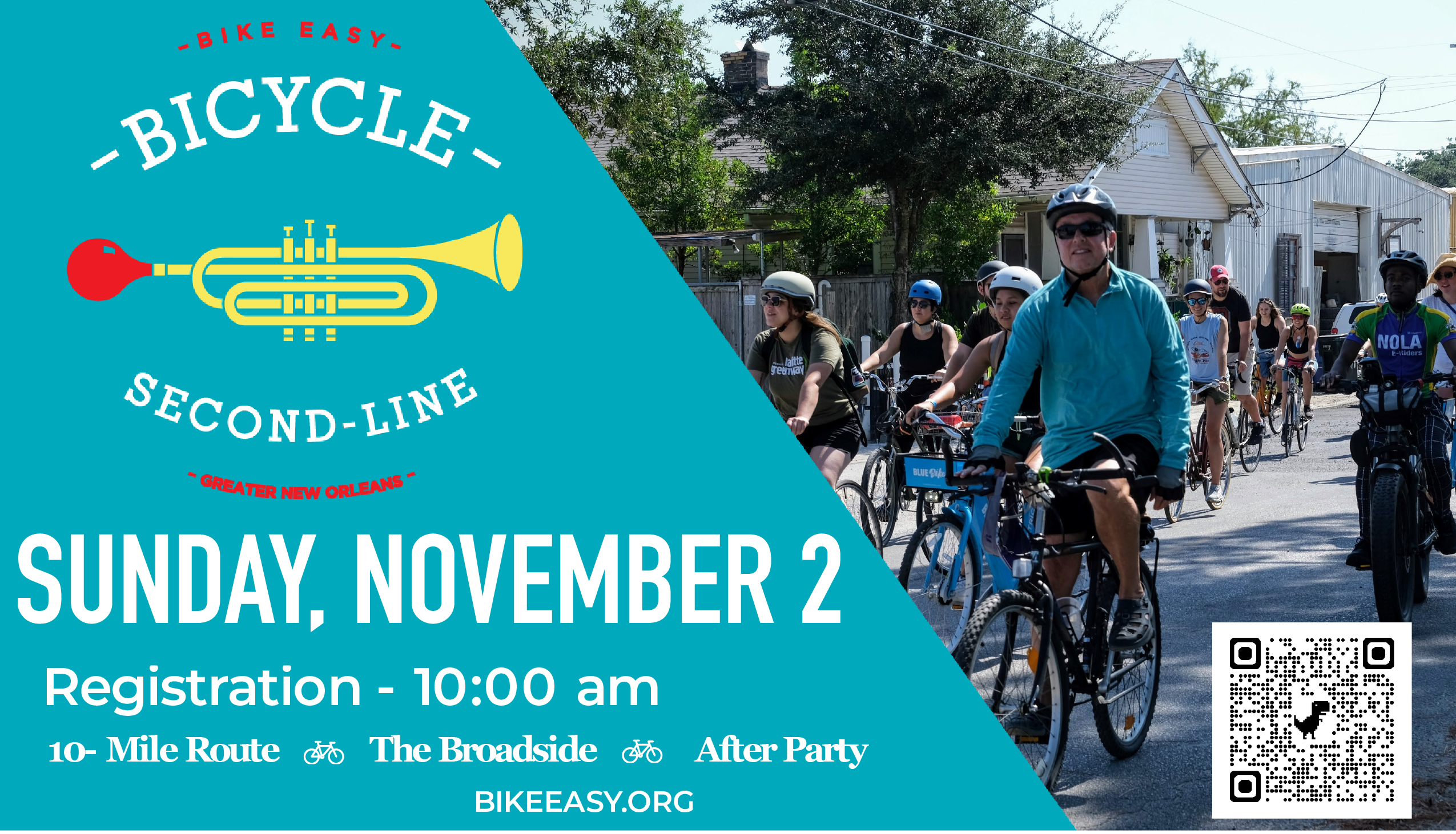 - Our Bicycle Second Line will be taking place on Sunday, November 2nd this year. Like last year, we will be posting up with a bike corral outside of the Broadside for the before and after-party. I could use a couple of dedicated and experienced volunteers like you to help me run this – we’ll still be able to ride with the group.