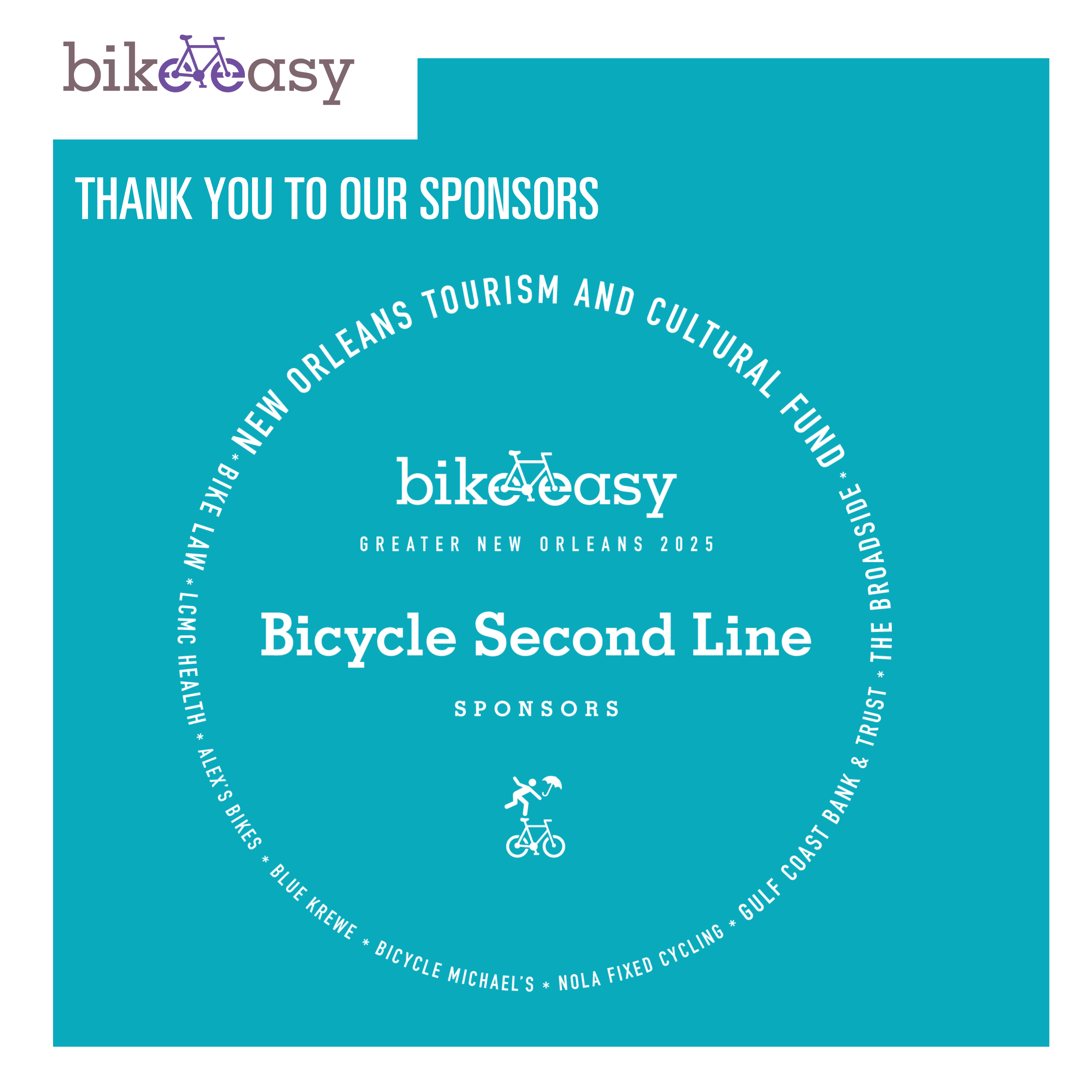 Thank you to all of our Sponsors, including the New Orleans Tourism and Culture Fund, Bike Law Louisiana, The Broadside, LCMC Heath, Gulf Coast Bank and Trust, Nola Fixed Cycling, Alex’s Bikes, Bicycle Michaels and Blue Krewe!