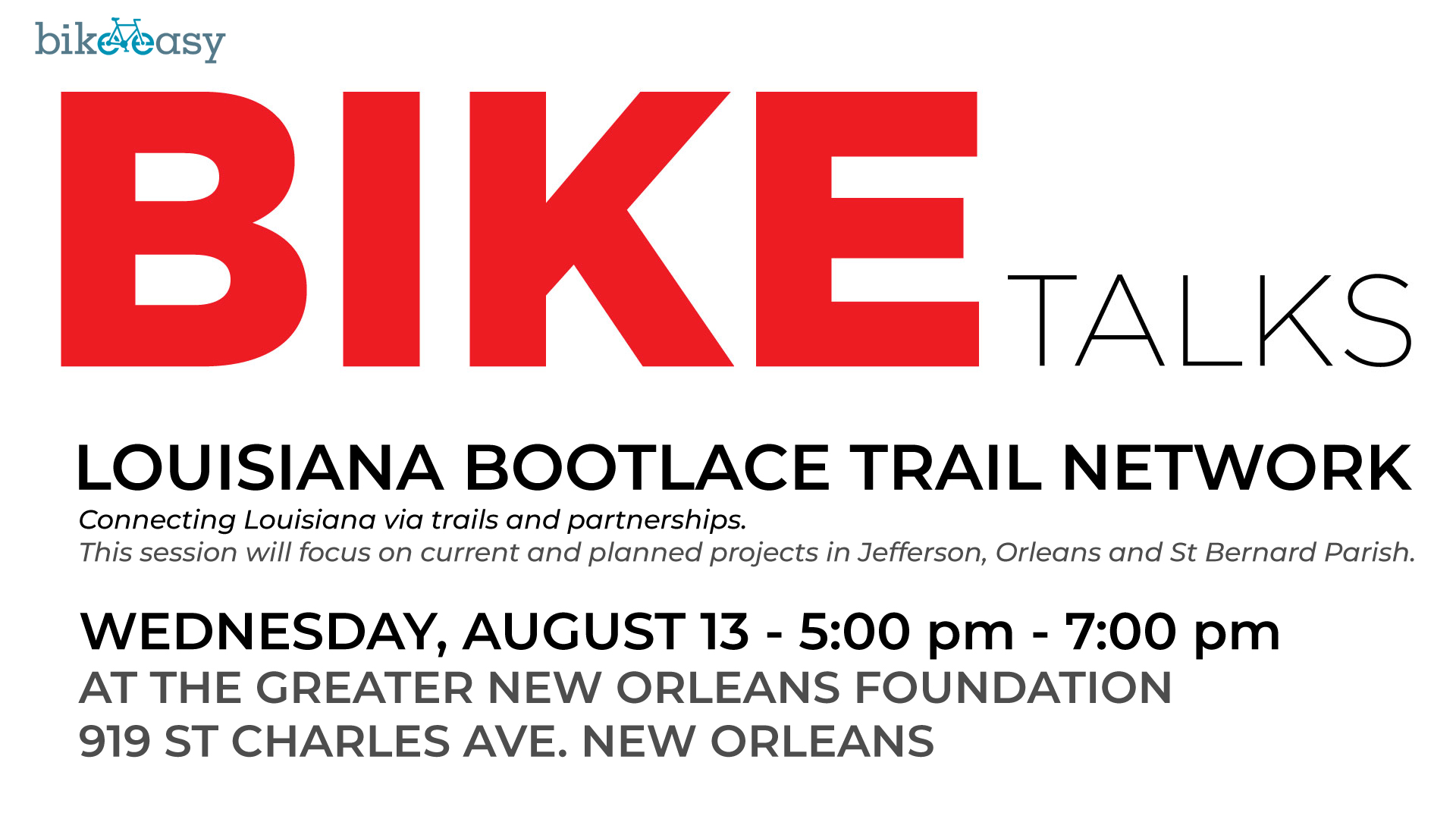 Join Bike Easy for the next installment of our BIKE Talks series, where we’ll explore the vision and progress behind the Louisiana Bootlace Trail Network—a proposed system of connected trails that aims to link communities and improve mobility through safe, equitable infrastructure.