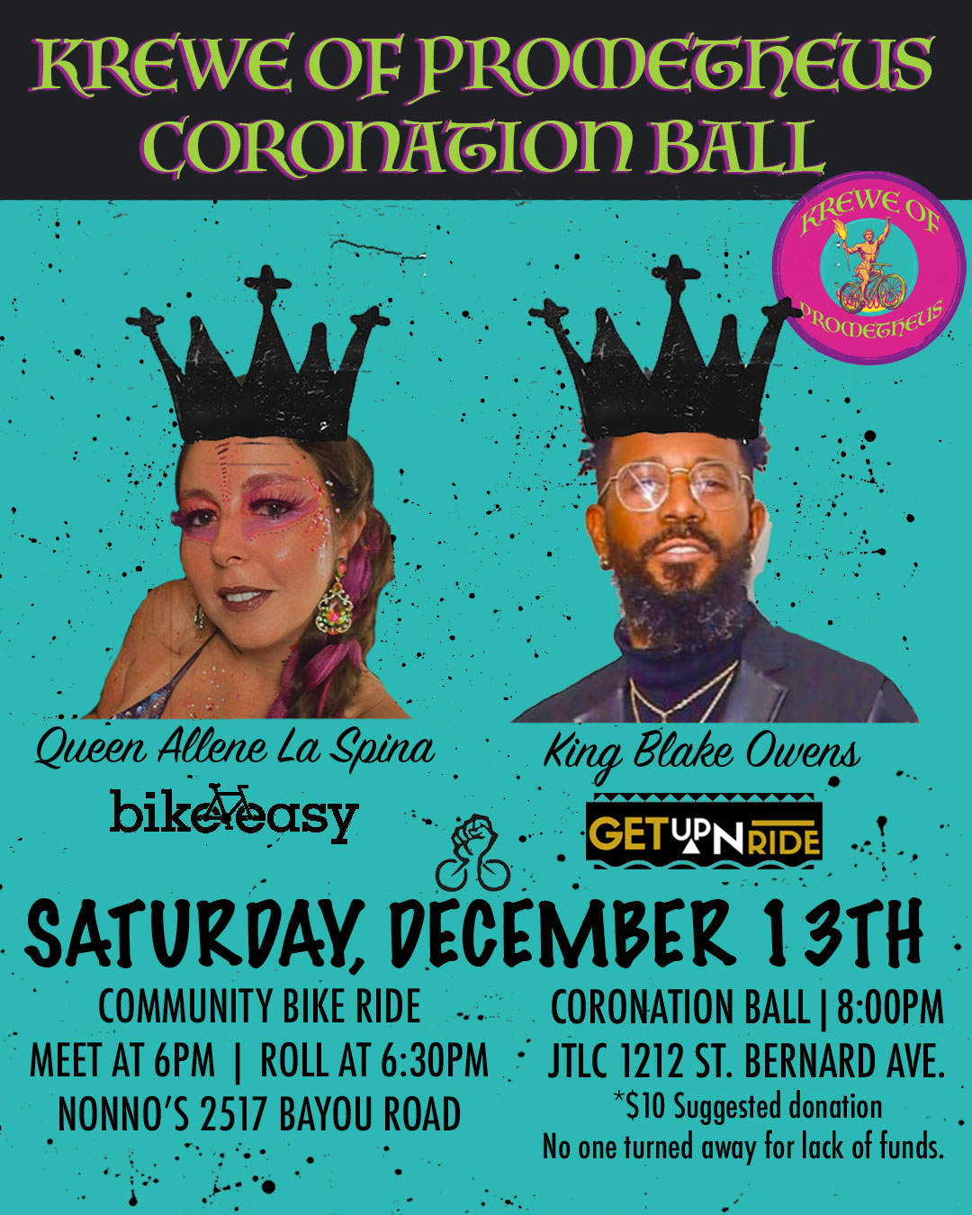 Honored to be the 1st Queen for Critical Mass’ 2026 Parade: Prometheus; taking place on Friday, January 23rd! Follow them on social media for more details. Blake Owens, previous Bike Easy Board Member and founder of Get Up N Ride will be joining me in the throne as we celebrate bringing the bike community together for big changes in our city!